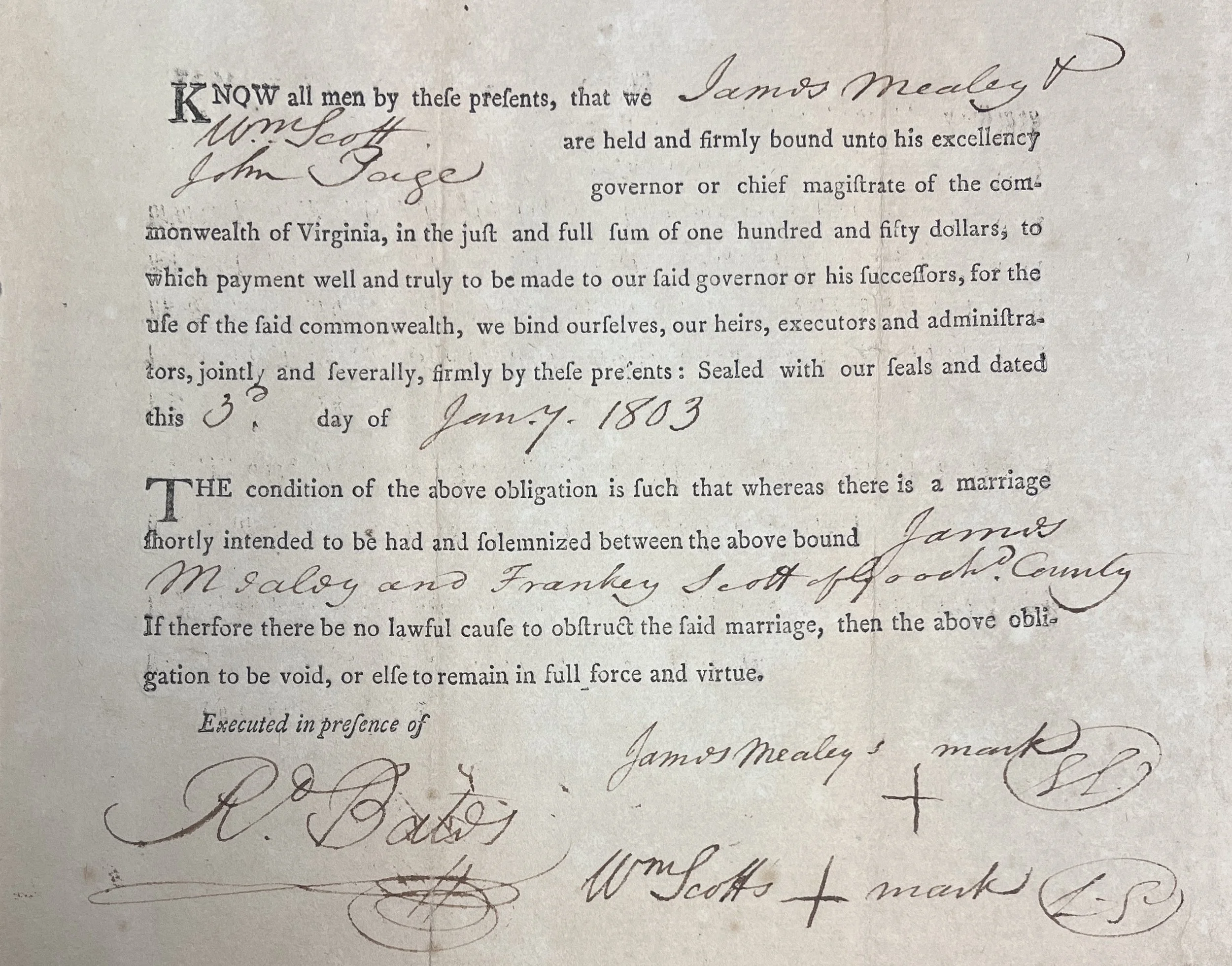 The original marriage bond for James Mealy and Francis Scott.