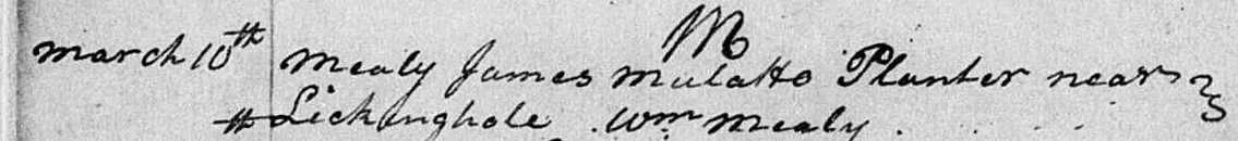James was born in 1763, likely in Henrico County, Virginia, to Elizabeth “Betty” Mealy, a free woman of color. Betty had a brother named Archer Mealy. They were orphaned in 1745, both recorded as mulattos. Elizabeth was unmarried when she gave birth to James, contrary to unfounded claims that she was married to an older man named James Mealy. The older James Mealy, who only appears on one record in 1746, could be another brother to Betty, or some other relation. In 1768, Betty gave birth to another son. She named him Archer, after her brother.