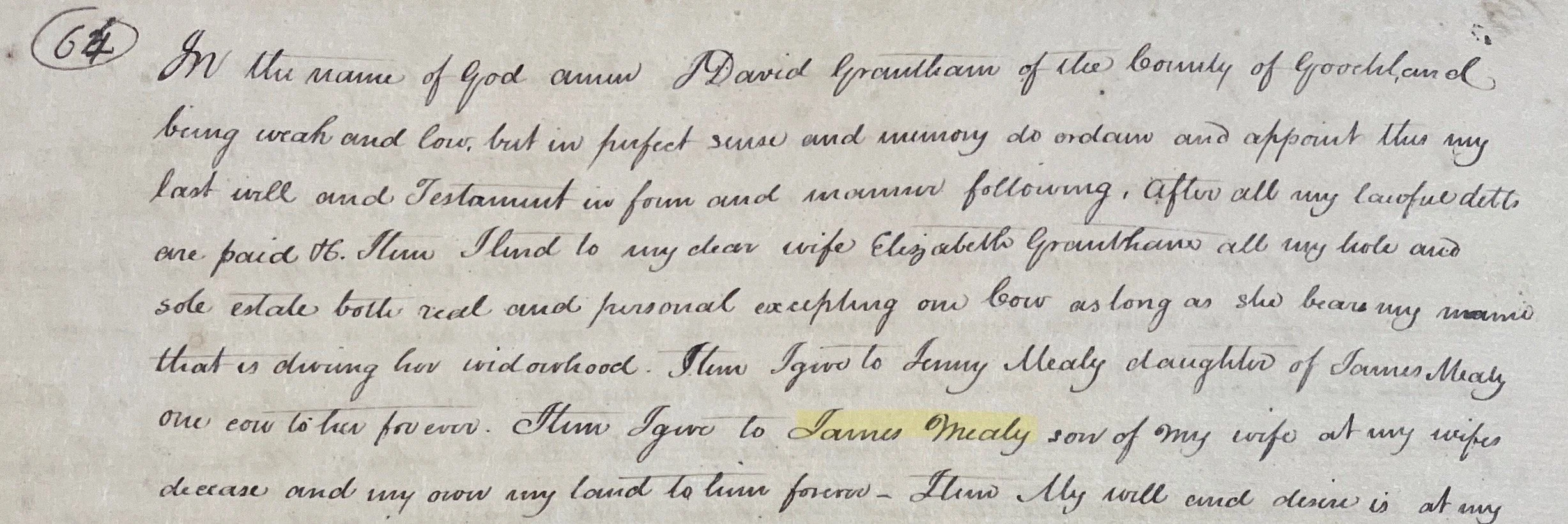 On 6 January 1803, James married Francis “Franky” Scott, the daughter of Robert and Elizabeth Scott. The following year, James Mealy’s stepfather, David Grantum, passed away. In his will, he bequeathed his land to James after the death of Betty Mealy Grantum. James had been living on the land for most of his life at that point, and likely took care of David. Betty died around 1820, after decades of serving her community as a midwife.