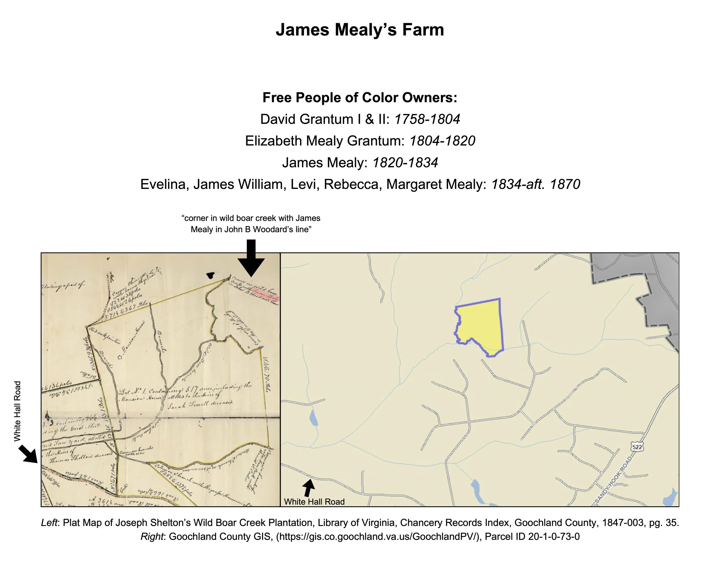 After the war, James returned to Goochland County. He was involved in at least two relationships in the late 1700s. One with Grace, a woman enslaved by David Shelton, which produced a child named Polly ca. 1785, and another relationship that may have produced his children William, Jenny, and Elizabeth.