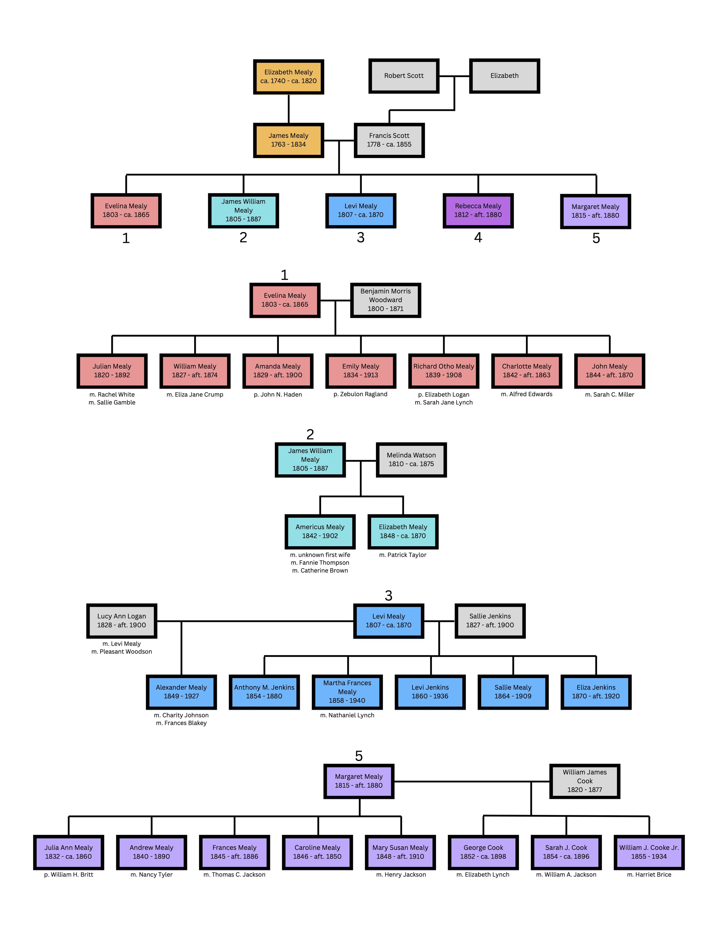 James and Francis’s third child together was Levi Mealy, born circa 1807. In 1850, he was working as a shoemaker and living in Louisa County, Virginia, with his partner Lucy Ann, their son Alexander Mealy, and Lucy Ann’s daughter, Elizabeth Logan. He was later engaged in a relationship with another free woman of color named Sallie Jenkins. Most of their children used the surname Jenkins as they got older. Their children were Anthony M. Jenkins, Martha Frances “Fannie” Mealy Lynch, Levi Jenkins, Sallie Mealy, Mary Jenkins, and Eliza Jenkins.