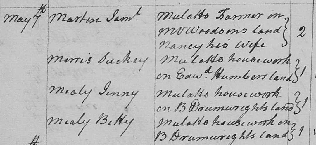 Jenny Mealy was explicitly referred to as the daughter of James Mealy in the 1801 will of David Grantum. She was likely born around 1792 considering her appearance on the 1813 tax roll. In 1811, a white man named Bennett Drumwright was charged with “living in fornication” with Jenny. Jenny was still alive on 23 March 1826, when her daughter Martha was bound to Bennett Drumwright for apprenticeship. Martha named her first child Virginia, which may have been Jenny’s full given name. Martha’s relationship with Benjamin Parrish was solemnized after he was freed from slavery. Their children were all born free, and they began using their father’s surname after 1865.