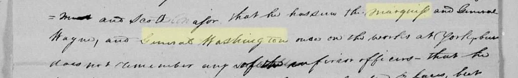 Mentions of the Marquis de Lafayette and George Washington in James Mealy’s pension file, pension file number S9408, click here to download the full transcription