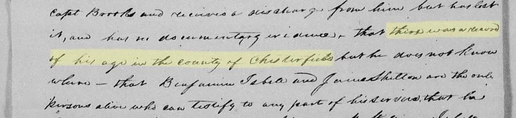 The reference to Chesterfield County in James Mealy’s Revolutionary War pension file.