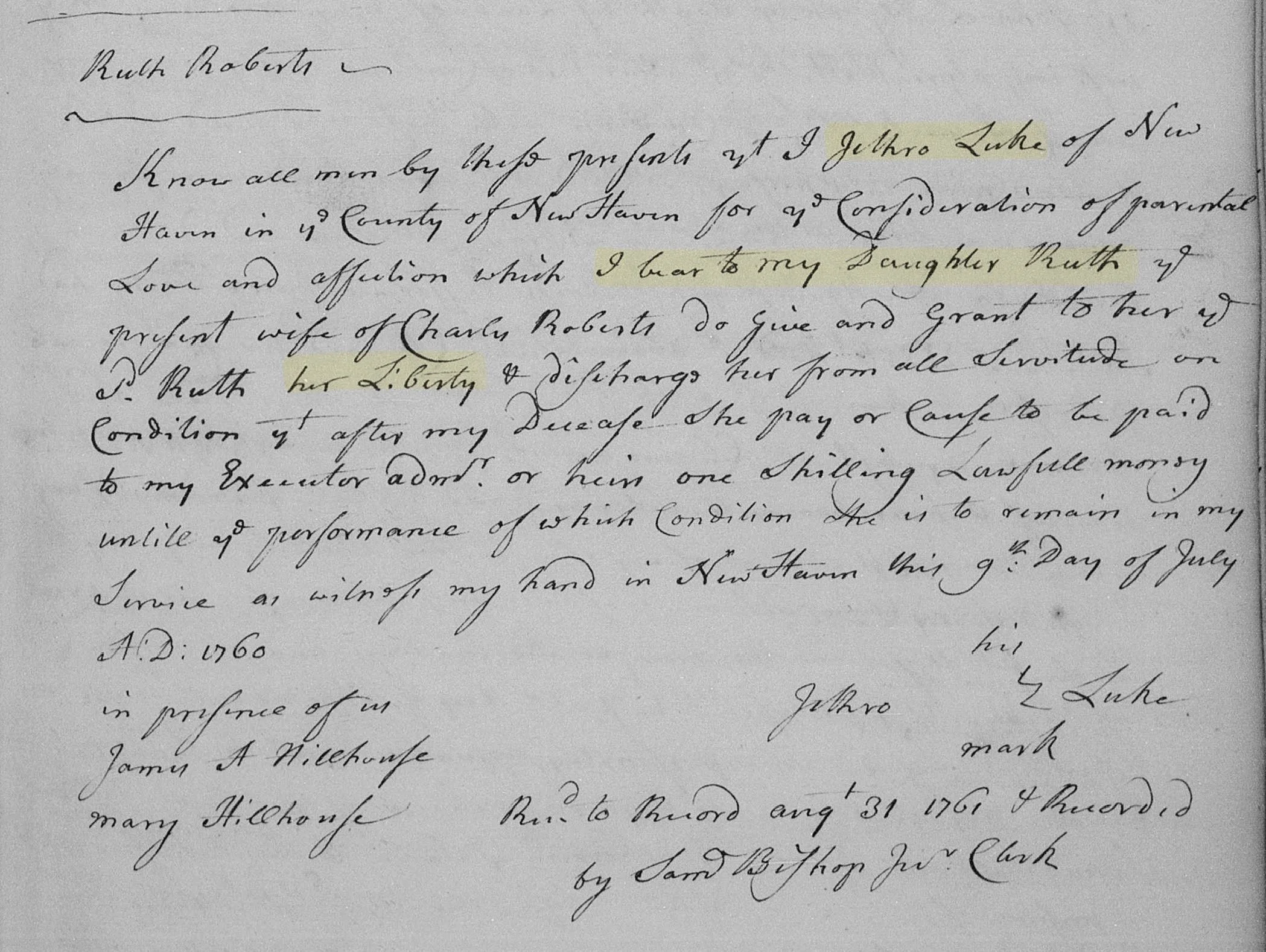 Jethro Luke was enslaved by Mary Hooker Pierpont, granddaughter of Connecticut’s founder Thomas Hooker. She was also the widow of James Pierpont, minister of the First Congregational Church in New Haven and a founding trustee of the Collegiate School, later known as Yale. On 19 May 1728, Jethro was baptized at First Congregational Church. It is believed that he was born around 1700. After Mary Hooker Pierpont’s death in 1740, Jethro and his wife Ruth were deeded their freedom by her heirs. Unfortunately, Jethro and Ruth had several children still in bondage. One of them was their son Gad, who Mary Pierpont deeded to her son Hezekiah three years earlier.